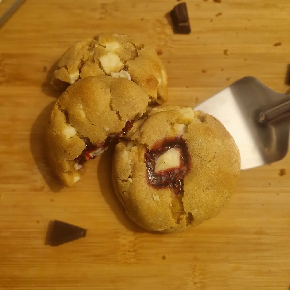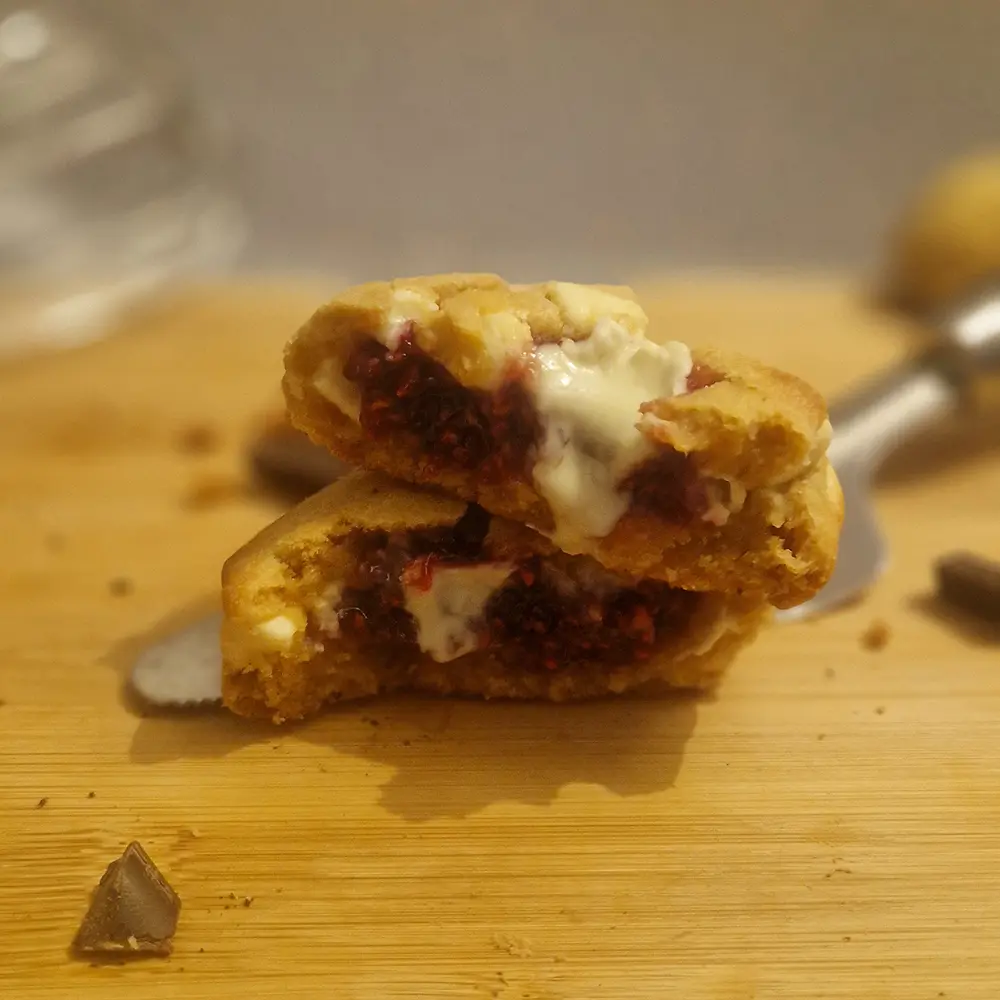 Farine de BLÉ, chocolat blanc, insert framboise (framboise, sucre), sucre, BEURRE, OEUF, vergeoise, levure chimique, extrait de vanille.