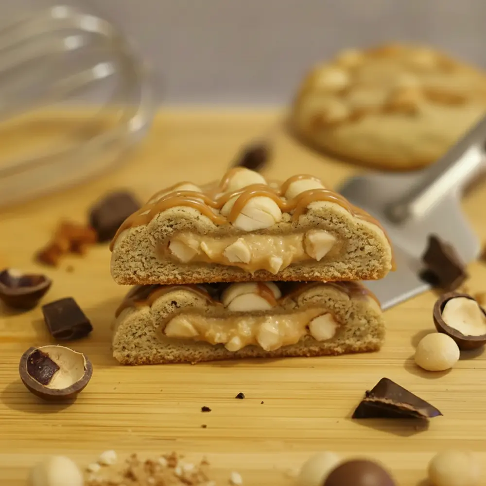 Farine de BLÉ, MACADAMIA, sucre, BEURRE, OEUF, vergeoise, levure chimique, extrait de vanille.