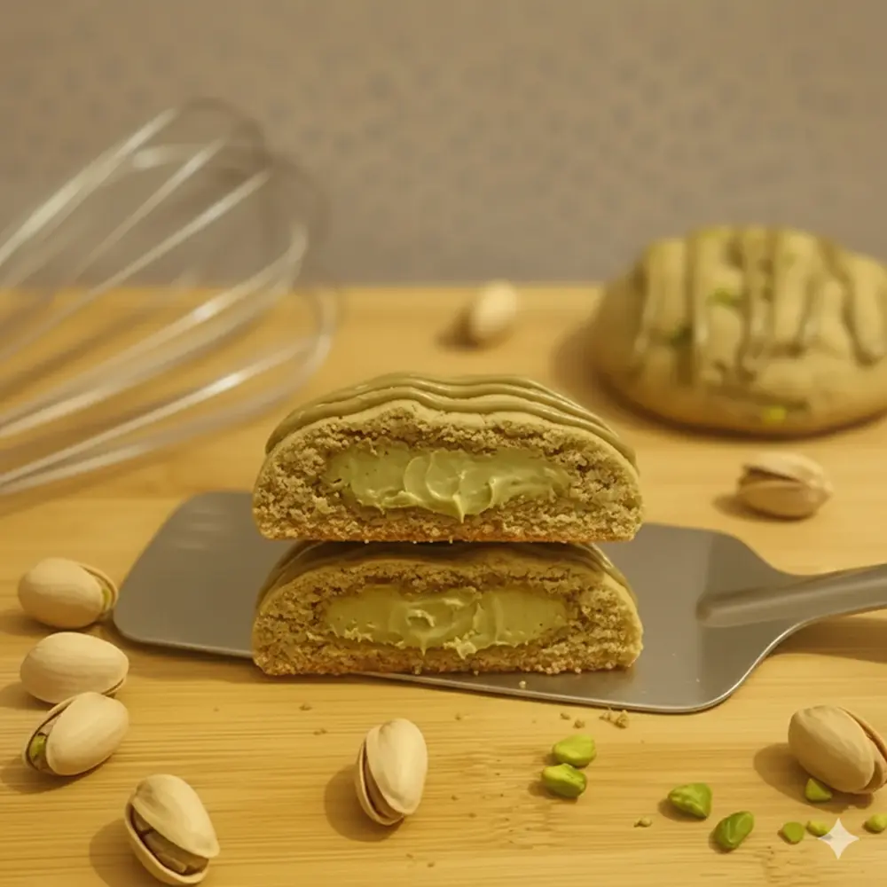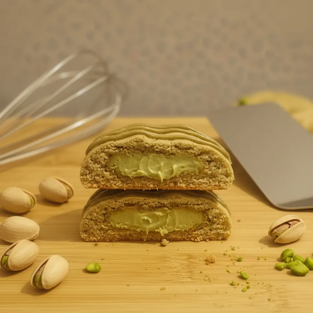 Farine de BLÉ, PISTACHE, chocolat blanc, sucre, BEURRE, OEUF, vergeoise, levure chimique, extrait de vanille.